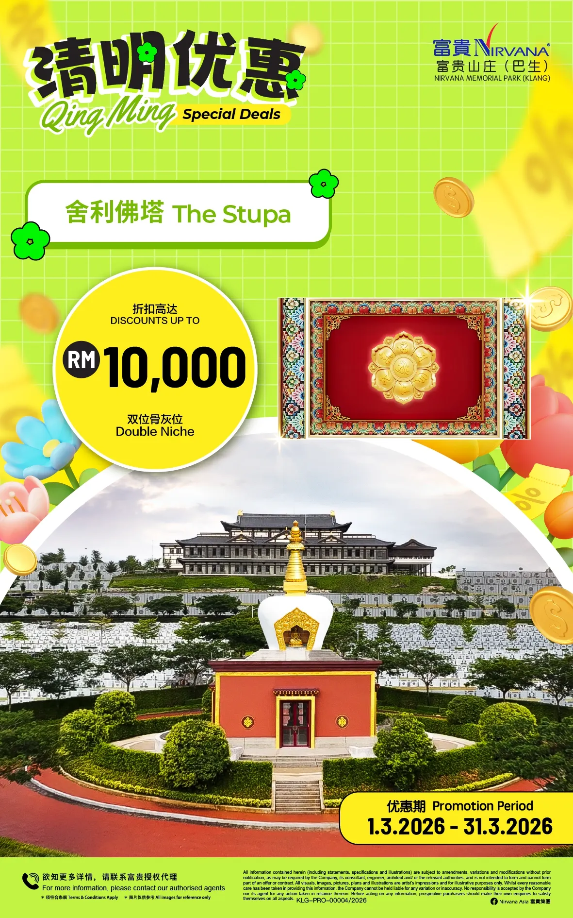 An awe-inspiring stupa is erected at the middle of Nirvana Memorial Park (Klang) to protect all sentient beings.